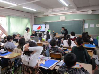 1組は英語。めあて:クリスマスに関する言葉や言い方を知ろう。楽しいクリスマスが間もなくやってきます。飾り物や食べ物などを学んだのでしょうか。