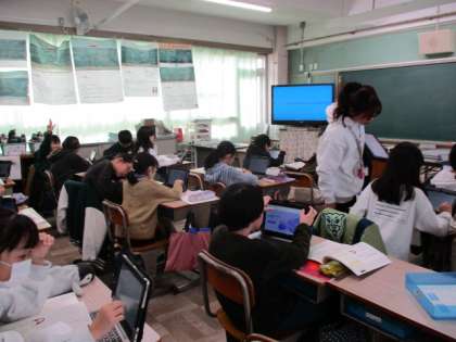 3組も国語。教材名:もしものときにそなえよう。めあて:学習した技を使って作文を書きます。先ずは、タブレットで下書きです。