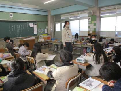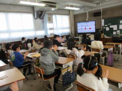 2組は道徳。教材名:親切がいっぱい。問:困っている人がいたら、君ならどうする?教室の中では助けると言えても、実際にそういった場に出くわすと、しり込みしてしまうときが多いのではないでしょうか。そんなときこそ、勇気を出す番です。