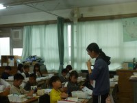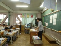 1年1組が明日の校外学習の説明を聴いています!5年生の人たちが宿泊から帰ってくる...