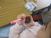 1年生がコマに絵をつけています。 回したときにきれいに見えるのは??とか、子ど...