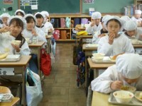 今日の給食は「コッペパン」と「牛乳」「ミートボールクリームシチュー」「小松菜サラ...