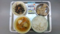 今日の給食は、ぎゅうにゅう、ごはん、やさいスープ、