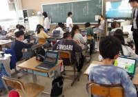 算数は分数のかけ算です。今日の学習のめあてを自分たちで考え、解決活動に取り組んでいました。
