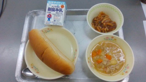 今日の給食は、牛乳、こくとうパン、ポトフ、