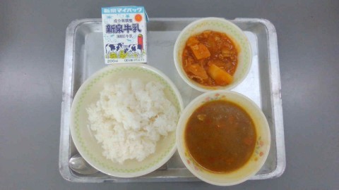 今日の給食は、牛乳、ごはん、カレモア、