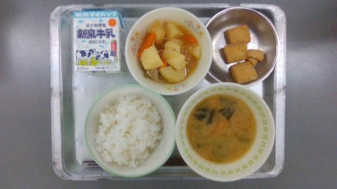 今日の給食は、牛乳、ごはん、ごもくじる、