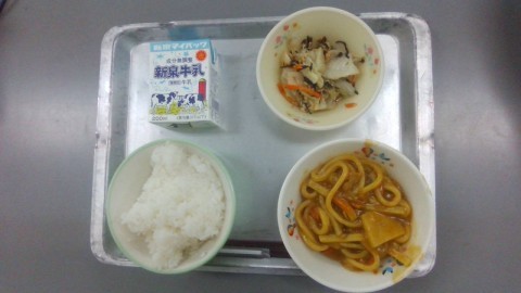 今日の給食は、牛乳、ごはん、カレーうどん、
