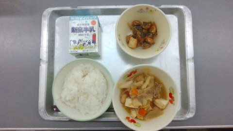 今日の給食は、牛乳、ごはん、すきやきふうに、