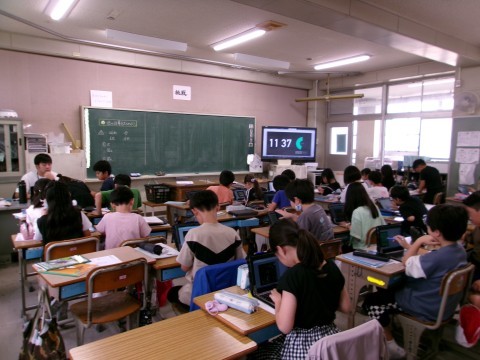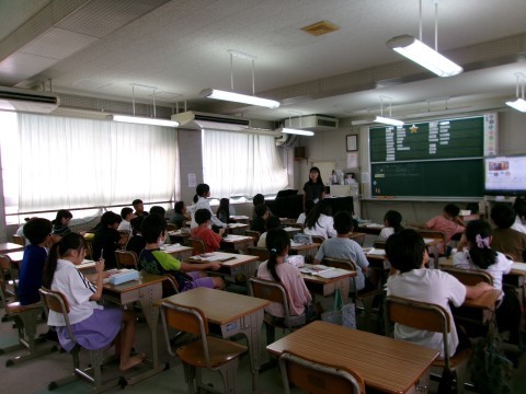 音楽は「ちいきにつたわる音楽をききましょう」を学習していました。「つづみ」を見て「あ,あの芸人さんがもってるやつ!」と盛り上がっていました。