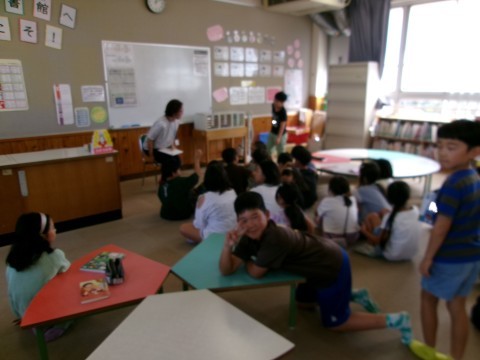 国語は図書です。図書の先生が読み聞かせをしてくれるので集まっていました。今日はどんなお話だったかな?