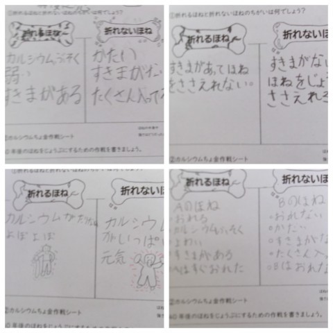 今日は栄養教諭に「カルシウム貯金をしよう」という授業をしてもらいました。骨のはたらきを確認し,模型を用いて骨量について考えていました。