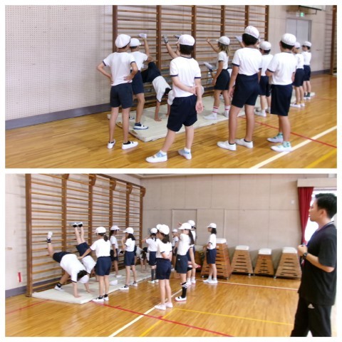 体育はマット運動です。まず肋木に足をかけながら腕立て倒立の練習をしていました。
