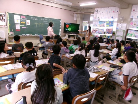 外国語活動はすきなものを紹介する学習です。自分の好きなものを「I like~」を使って紹介する方法を確認していました。