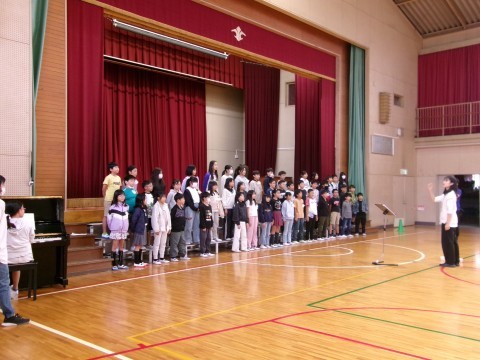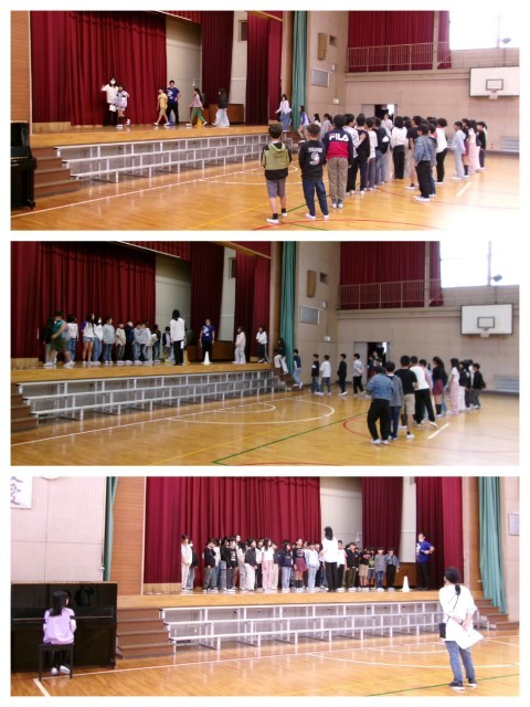 本番をイメージして自席からステージへ移動する方法を練習していました。足音を立てずに移動できるよう,移動も集中していました。