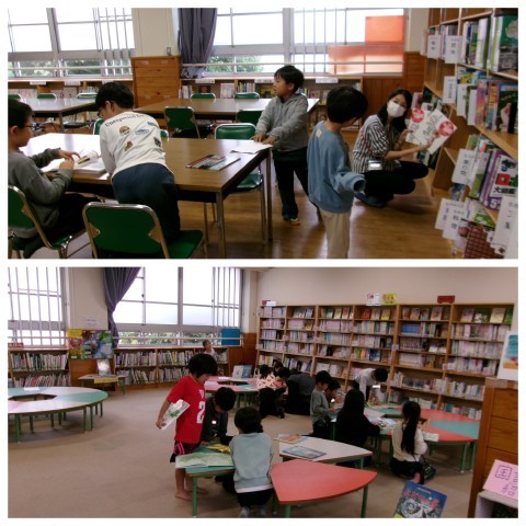 国語は図書の時間でした。司書の先生に借りたい本を一緒に探してもらったり,友達と楽しく読んだりしていました。