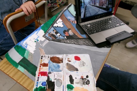 図工は「思い出のアルバム」の作品を仕上げていました。自分が撮った写真を見ながら色を塗っていました。