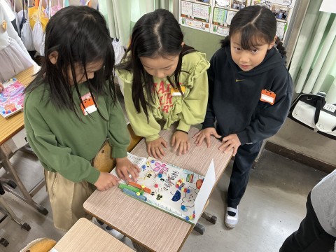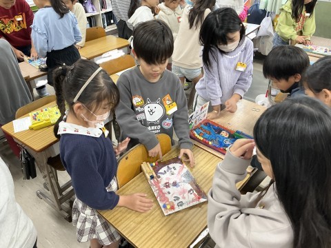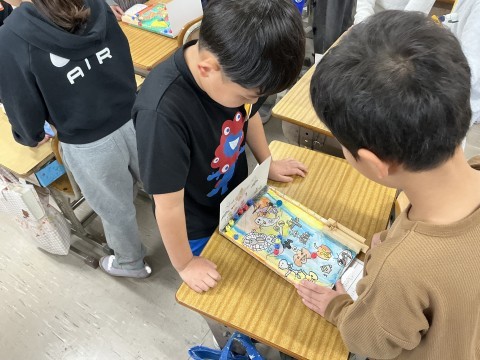 3年生が2年生をお招きして,自分が作ったくぎうちとんとんの作品で遊んでもらっていました。お客さんをお招きしてとても楽しそうでした。