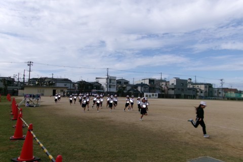 かけあし記録会の練習をしていました。まだはじめてなので,自分のペースがわからず,最後は歩いてしまっている人もいました。自分のペースで最後まで走ることが大切です。本番までかけあし朝会で自分のペースをつかんでくださいね。