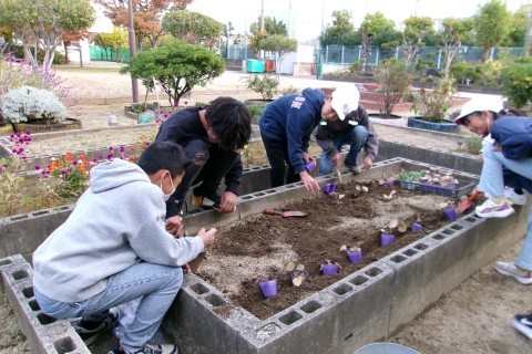 環境委員会が,地域の花ボラさんからいただいた花苗を花壇に植えていました。寒い時期に強いビオラなどです。これからお花が咲くのが楽しみです。