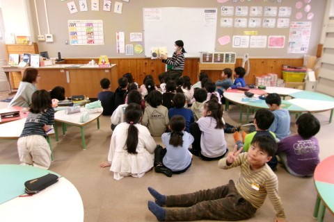 国語は図書です。司書の先生が読み聞かせをしてくれていましたよ。楽しいお話で子どもたちから笑い声があがっていました。