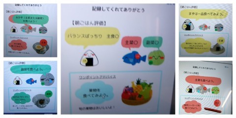 食育アプリを使って今朝の朝ごはんの栄養バランスをチェックです。不足しているものは少しずつ改善できるといいですね。