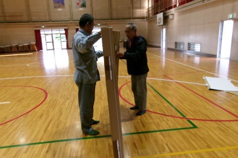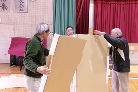 明日の防災訓練に向けて,地域の自主防災担当のみなさんと区役所の自治推進課の方が来ていただき,段ボールベッドなどの準備をしてくれました。
