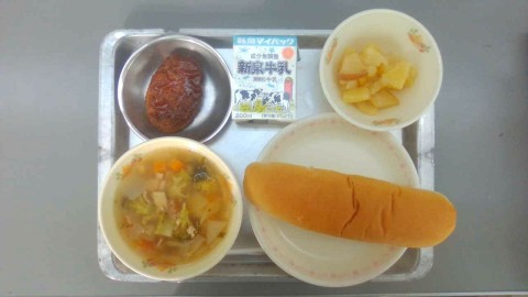 今日の給食は、ミルクパン、ぎゅうにゅう、