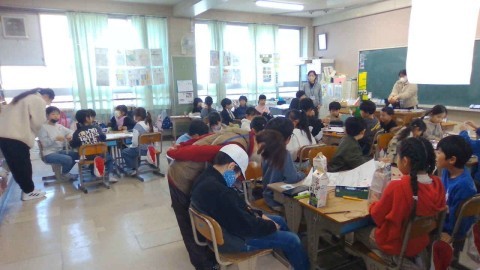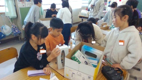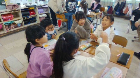 12月9日の朝の会は、2年生との交流会でした。たんぽぽのメンバーは2チームに分かれて、それぞれ2年1組・2年2組のこどもたちとおもちゃの工作をして楽しみました。おもちゃの作り方の説明を一生懸命してくれる2年生に対して、たんぽぽのメンバーも一生懸命聞いていました。また、なかにはおもちゃづくりでわからないところがあると、「これはどうしたらいいの?」と聞くたんぽぽの児童や、どうすれば上手にできるのかを追加で教えてくれる2年生の姿も見られました。2年生のみなさん、とっても楽しかったです。ありがとうございました。