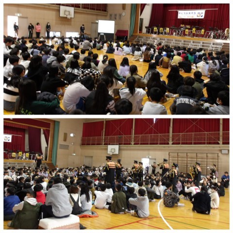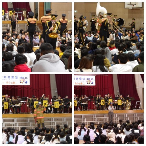 まずはじめに火事や地震のときにどうすればいいのかを教えてもらい,いよいよ音楽隊の演奏です。