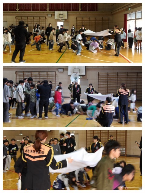 最後は消防隊のみなさんの演奏のもと,火事でけむりに囲まれたときに教えてもらった脱出の方法で退場をしました。