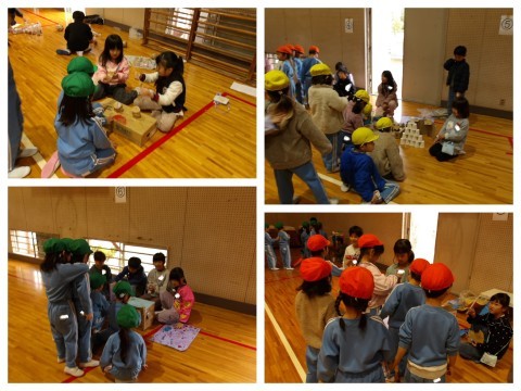 生活科でみつけた秋のものを使ったおもちゃなどを用意し,幼稚園のお友達と一緒に遊びました。