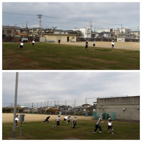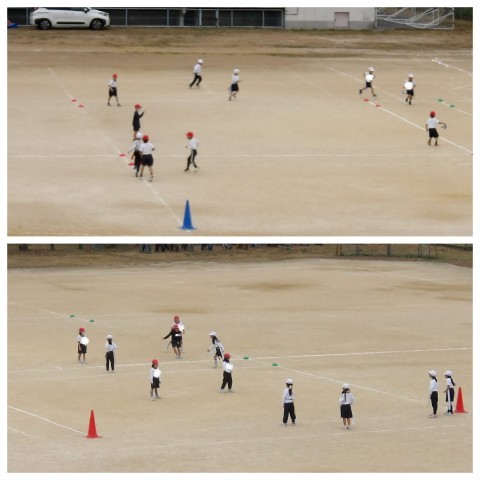 体育はどちらのクラスもしっぽとりをしていました。色分けされたタグを使いチームに分かれて逃げたり取ったりしていました。