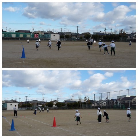 体育はしっぽとりをしていました。タグを取られずにゴールまで上手に逃げきっている子が多かったです。