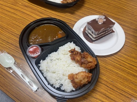今日のメニューはカレーライスと唐揚げ,そしてチョコケーキでした。