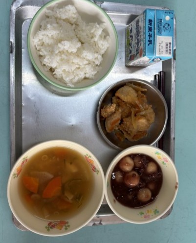 今日の給食は、ごはん、ぎゅうにゅう、のっぺいじる、