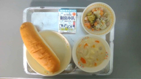 今日の給食は、コッペパン、ぎゅうにゅう、