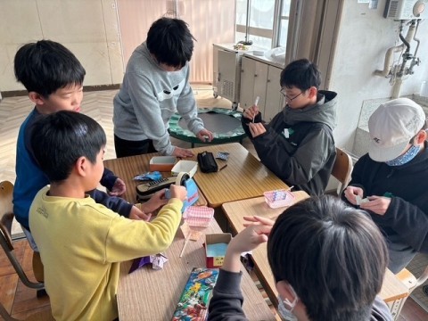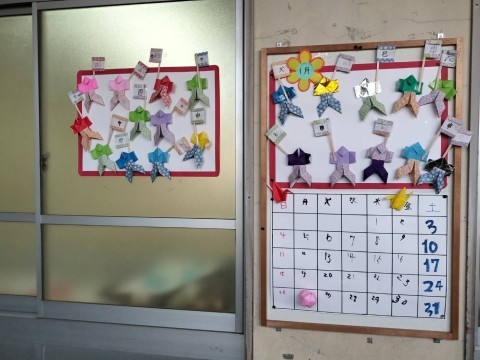 1月13日の火曜日は2026年初の朝の会をしました。内容は1月のカレンダーづくりです。みんなで折り紙でやっこさんを折りました。やっこさんの袴がなかなか難しく、苦労しているこどもたちの姿が見られましたが、折れる子が「こうだよ」と教えに行く姿も見られました。最後は自分の干支を書いた紙をやっこさんに持たせて、完成です。とっても素敵なカレンダーが出来上がりました。