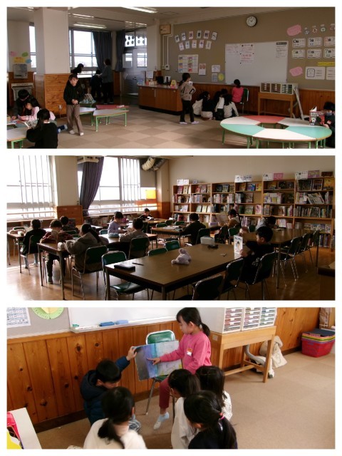 国語は図書です。先生の真似をして読み聞かせをしているグループもありました。