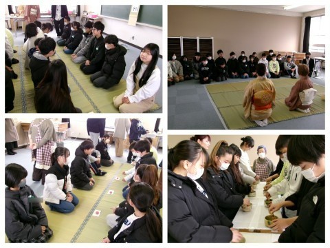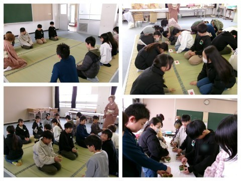 茶道の先生に来ていただき,お軸やお花も用意していただいてお茶室の雰囲気も体験しました。