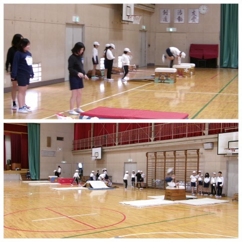 体育はとび箱運動です。今日は台上前転を練習していました。自分の目標に合わせて練習の場を選んでいました。