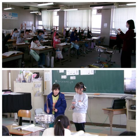 音楽は「がっきでおはなし」の学習をしていました。先生に当ててもらった子が前に出てリズム打ちをしていました。聴いている子はそれがどのリズムかを当てていました。