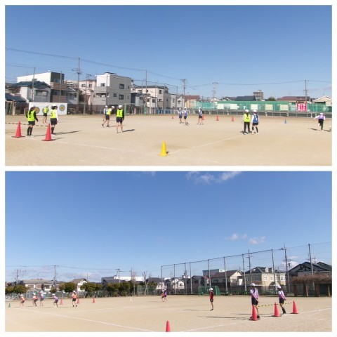 体育はサッカーです。4チームに分かれてゲームをしていました。ラインの外での1対1などルールが工夫されていて,みんなが積極的にボールを追いかけて得点に貢献していました。