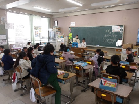 国語は「カンジー博士の大はつめい」です。二つの漢字を合体させてできる漢字をクイズにして発表していました。