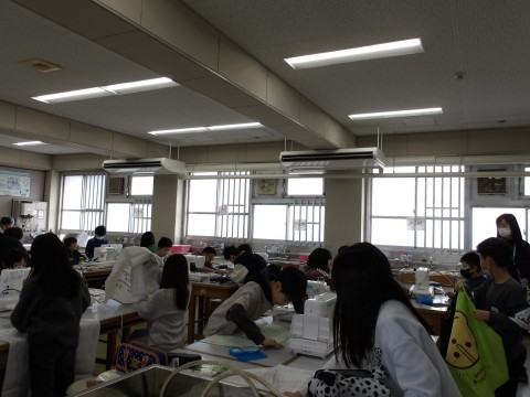家庭科はエプロンづくりに入っていました。事前に学習したミシンの使い方をいかして取り組んでいました。
