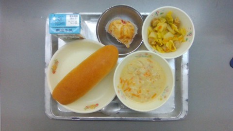 今日の給食は、ミニコッペパン、ぎゅうにゅう、