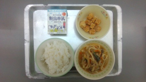 今日の給食は、ごはん、ぎゅうにゅう、すきやきうどん、