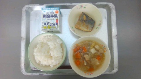 今日の給食は、ごはん、ぎゅうにゅう、さばのみそに、