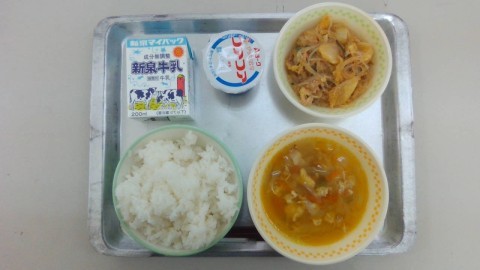 今日の給食は、ごはん、ぎゅうにゅう、ぶたキムチ、