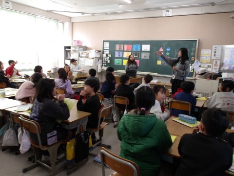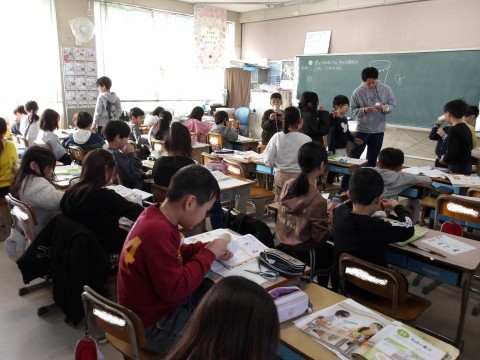 理科は音の学習で糸電話を作っていました。出来上がって試してみると「ほんまに聴こえる~」と感動している子がいました。